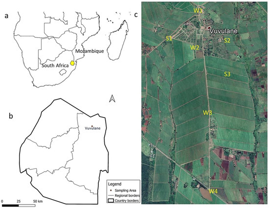 Overview maps of the study area. (a) A geographical map of Southern Africa showing the location of Eswatini; (b) a map of Eswatini showing the location of the study area; (c) the distribution map of the soil (S) and water (W) sampling points in the study area.