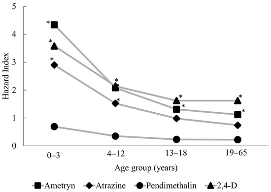 Hazard Index values at the 95th percentile show the multi-pathway risk of exposure to the four target pesticides for each age group. * Hazard Index > 1.