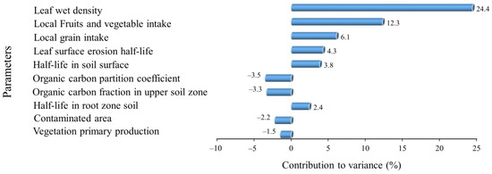 None of the studies conducted in developing countries cited in this paper conducted health risk assessments for local residents. However, the high concentrations of pesticide residues in the soil and water samples could suggest a high health risk, as our study and others [6,75] show that the ingestion pathway is the most dominant contributor to the total risk. Our risk assessment analysis only considered exposure to our four target compounds contributed by the analyzed environmental media. To determine the relative changes in total risk due to changes in the model inputs, we performed a sensitivity analysis. Due to our target compounds being present mainly in soil and water and their transportation through environmental media, our sensitivity analysis indicates that health risks arise from human exposure parameters and the characteristics of the target compounds; the environmental parameters in the model are comparatively less sensitive (Figure 4). This implies that the amounts of pesticides used has a significant impact on the total risk, as pesticides’ properties such as their half-life in soil are sensitive. The dietary intake of local produce was sensitive, as it had the highest contribution to the total risk.