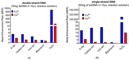 Metal enhancement ratio’s (MER) were calculated from the D50 and IC50 values from Table 1 and described in the Materials and Methods section. For ionizing radiation with dsDNA, the MER demonstrated a fold reduction of 5.18×, 5.09× and 3.74× with Cu2+ and 2.84×, 1.77× and 1.6× with Co2+ following X-ray, carbon-ion or iron-ion, respectively. Bleomycin showed the smallest MER values. The MER demonstrated a fold reduction of 914.94× with Cu2+ and 113.41x with Co2+ following H2O2 (Figure 3a). For ionizing radiation with single-strand DNA, the MER demonstrated a fold reduction of 18.37×, 21.96× and 22.92× with Cu2+ and 5.97×, 2× and 1.57× with Co2+ following X-ray, carbon-ion and iron-ion, respectively. The MER values for SSB were greater values than for DSB. Bleomycin showed the smallest MER values. The MER demonstrated a fold reduction of 110,493× with Cu2+ and 15.15× with Co2+ following H2O2. (Figure 3b). Therefore, metal ions affected both SSB and DSB formation induced by tested chemicals and radiation. Hydrogen peroxide affected DNA damage the most followed by low-LET radiation and high-LET radiation, and bleomycin affected the least. Copper ions presented stronger effects than cobalt ions. SSB formation was enhanced more with metal ions than DSBs. Metal effects for DNA damage were LET-dependent for SSB formation but inversely dependent for DSB formation.