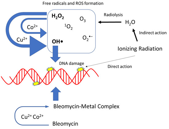 Yields of radicals in solution can be affected by factors including pH, temperature, solvents and substrates [7,8]. As the hydroxyl radical scavengers, such as dimethyl sulfoxide (DMSO), attenuate radiation effects [9], the amount of hydroxyl radicals can interfere with DNA damage yields. This is because metal ions and hydrogen peroxide can cause Fenton reactions, thus producing greater amounts of hydroxyl radicals [10]. Therefore, the interaction among radicals can be interfered with by adding metal ions and may maximize the indirect action of radiation to enhance the radiation effects on DNA damage. Superoxide dismutase and Catalase are endogenous enzymes that reduce final hydroxyl radical formation [11]. Interestingly, another DNA DSB-inducing agent, bleomycin, has a metal-binding domain and requires metals and oxygen to cleave DNA [12,13,14,15]. Bleomycin and the metal complex create radicals and contribute to DNA damage. Various studies support adding different metals to increase radiation or drug induced hydroxyl radical formation and DNA breaks [7,16,17,18,19].