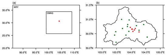 (a) The domains of the WRF and CMAQ models. The red dot indicates the position of Chengdu, China; (b) spatial distributions of environmental monitoring stations (red dots) and meteorological stations (green dots) in Chengdu.