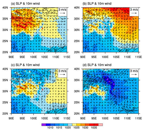 Spatial distributions of sea level pressure (SLP; hPa) and 10 m wind fields (m/s) in Chengdu during autumn–winter in 2018–2022 under the four dominant weather patterns: (a) high-pressure rear; (b) high-pressure bottom; (c) homogeneous-pressure; and (d) low-pressure conditions.
