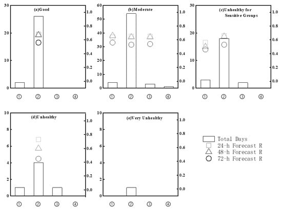 Evaluations of the 24, 48, and 72 h forecasts of daily fine particle concentrations in Chengdu during the period of 1 November 2021 to 28 February 2022 under the four dominant weather patterns (① high-pressure rear, ② high-pressure bottom, ③ homogeneous pressure, and ④ low pressure) based on the AQI: (a) good; (b) moderate; (c) unhealthy for sensitive groups; (d) unhealthy; and (e) very unhealthy.