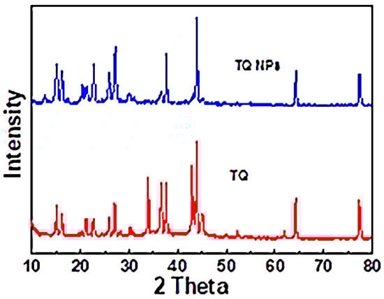 Figure 1 illustrated the characteristic patterns of the synthesized TQ NPs, which were measured via the Shimadzu 6000, Kyoto, Japan. TQ appeared exhibited patterns at 12.4°, 14.95°, 16.1°, 21°, 22.8°, 25.8°, 26.9°, 30.4°, 33.9°, 36.65°, 37.66°, 43°, 43.8°, 45°, 50°, 52.2°, 62°, 64.3°, 77.4°, while the TQ NPs have characteristic XRD patterns at 12.4°, 15°, 16.1°, 20.4°, 21.2°, 26°, 27°, 30.1°, 36.5°, 37.8°, 43.8°, 44.9°, 64.3°, 77.4°. The results reveal that the patterns at 33.9°, 43°, 50°, and 52.2° disappeared while the patterns at 36.65 and 45 presented weak intensity; all of these were comparable to the patterns of NTQ. The results confirmed the formation of TQ NPs. From the Scherrer equation, the diameter of the TQ NPs was found to be 36 nm.