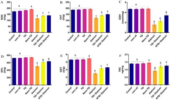 The impact of TQ and NTQ antioxidant status on hepatic tissue contents of DZN-treated rats. (A) SOD, (B) CAT, (C) GSH, (D) GPx, (E) GST, and (F) TAC. The data are presented as mean ± SEM. a–d Different superscript letters indicate a statistically significant difference between means at p < 0.05.