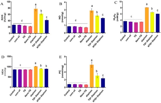 The results reveal that the concentration of ROS, NO, H2O2, MDA, and PC in the DZN group was much greater than in the control groups. The TQ and NTQ groups co-treated with DZN demonstrated a substantial decrease in their quantities compared to the DZN-treated rats. The improvement was more apparent in the NTQ group treated with DZN than in the TQ group treated with DZN (Figure 3).