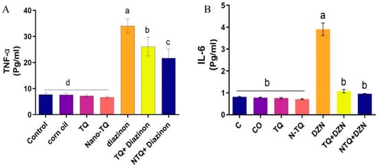 According to the findings, the concentration of TNF-α and IL-6 in the DZN-treated rats was notably higher than in the other groups. The TQ and N-TQ groups co-treated with DZN exhibited a marked reduction in concentration in the DZN-treated group. The improvement was more apparent in N-TQ group treated with DZN than in the TQ group treated with DZN, as seen in Figure 4.