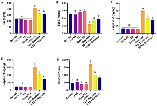 Impact of TQ and NTQ on apoptosis marker status in hepatic tissue contents of DZN-treated rats. (A) Bax, (B) Bcl2, (C) Caspase-3, (D) Caspase-9, (E) Bax /Bcl2 ratio. The data are presented as mean SEM. a–e means with distinct superscript letters differ statistically substantially at the p < 0.05.