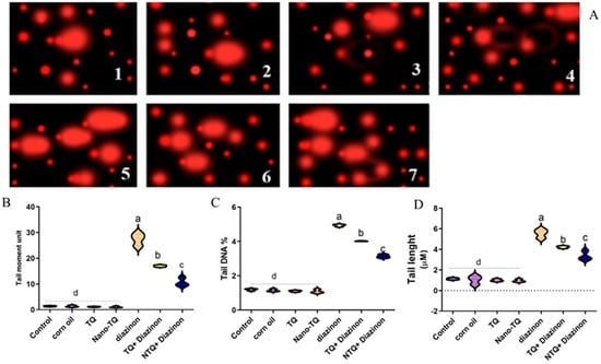 The results show that the DZN group had considerably higher levels of tail DNA, tail length, and tail moment than the control group and the other treatment groups. The TQ and NTQ groups co-treated with DZN demonstrated a meaningful decrease in these levels compared to the DZN-treated rats. The improvement was more apparent in N-TQ group treated with DZN than in the TQ group treated with DZN; the enhancement was more evident in the NTQ group than in the TQ-treated rats, as shown in Figure 6.