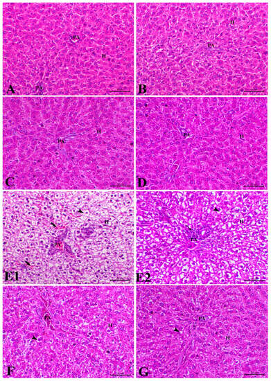 Sections of the liver were cut at 5–7 μm in thickness using a microtome and stained with eosin and hematoxylin after being accurately fixed in a 10% neutral formalin solution, dehydrated in an escalating series of ethanol, cleaned in xylene, and embedded in paraffin wax. Histopathological alterations were identified by visually inspecting the stained sections under a light microscope [].