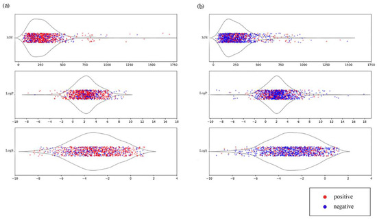 Distribution of physicochemical properties for MN in vitro (a) and MN in vivo (b) datasets. From top to bottom the following properties are presented: Molecular weight (MW), octanol–water partition coefficient (logP) and water solubility (logS). Dots are values of the property for each chemical, the violin plots represent the number of compounds with the same values (density). Positive compounds are colored in red and negatives in blue.