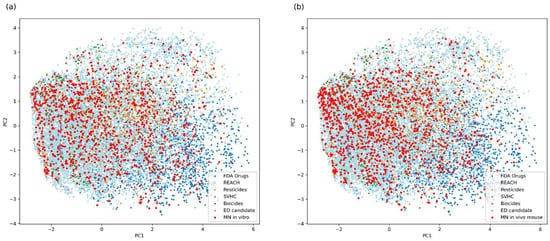 2D PCA visualization of chemical space of compounds found in MN in vitro (a) and in vivo (b) datasets and in the lists of REACH registered substances, FDA Drugs, pesticides, biocides, substances of very high concern (SVHC) and endocrine disruptor candidates (ED candidates). Data points represent compounds encoded as 166-bit MACCS fingerprints on the first two principal component dimensions.