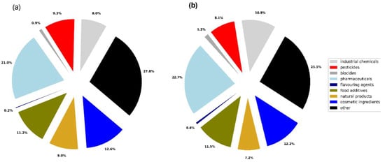 We also performed the evaluation of MN in vitro and in vivo substances by their main use and manufacturing using the PubChem database. The results are shown in Figure 3. The majority of substances in both datasets are represented by pharmaceuticals, followed by cosmetic ingredients and food additives.
