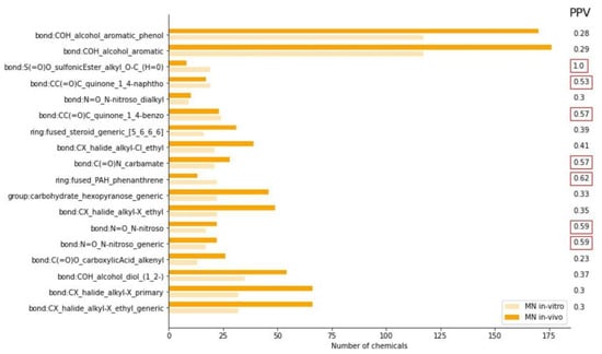 The positive CTs that are common for both endpoints represent a particular interest. Previously, based on expert assessment, Canipa et al. [49] reported 19 structural alerts that can predict both in vitro and in vivo chromosome damage without differentiating between chromosomal aberration and MN in vivo tests. In our study, we identified only 4 CTs enriched in the positive space of both datasets, particularly nitroso substructures, PAH_ phenanthrene and S(=O)O_sulfonicEster_alkyl_O-C_(H=0). To further explore the relevance of CTs over-represented in MN in vitro dataset for in vivo prediction, PPV for each CT enriched in MN in vitro was calculated for the MN in vivo dataset. CTs with PPV ≥ 70% were considered highly relevant for MN in vivo, while CTs with 50% < PPV < 70% and PPV < 50% were considered as moderately and poorly correlated with in vivo data, respectively (Figure 4). Among 18 CTs positively enriched in MN in vitro data, only 1 was found to be strongly associated with MN in vivo (PPV ≥ 70%), specifically “bond:S(=O)O_sulfonicEster_alkyl_O-C_(H=0)”. Alkyl esters of alkyl or sulfonic acids induce genotoxicity via DNA intercalating mechanism and present a significant safety challenge to drug producers and regulators [50]. Meanwhile, 6 CTs showed PPVs between 50% and 70%, indicating moderate relevance for in vivo prediction.