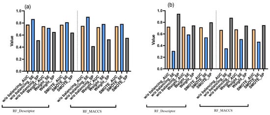 Performance of the RF models without balancing and using class weighting and SMOTE balancing methods in combination with molecular descriptors and MACCS fingerprints trained on the MN in vitro (a) and MN in vivo data (b), respectively. Average values of ten-fold cross-validation are presented.