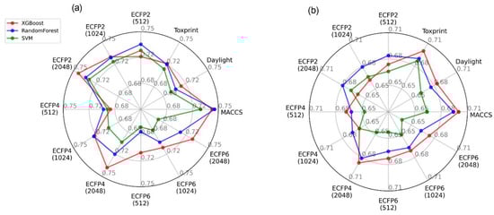 AUC values of models in combination with different fingerprints on the (a) MN in vitro and (b) MN in vivo, respectively. Models were trained using SMOTE or class weights balancing for MN in vitro and in vivo, respectively. Average values of ten-fold cross-validation are presented. Numeric values are presented in Tables S8 and S9.