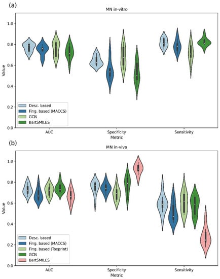 Two conventional ML methods (RF and XGB) combined with selected molecular descriptors and fingerprints (MACCS and MACCS and Toxprint fingerprints for MN in vitro and MN in vivo, respectively) and two cutting-edge algorithms, namely GCN and BARTSmiles, were used for target endpoint prediction. The performance of the models obtained through a ten-fold cross-validation framework using balanced data where appropriate is presented in Figure 8. Among individual models, the best predictive performance for the MN in vitro dataset was achieved with RF in combination with descriptors using SMOTE balancing (0.77, 0.81 and 0.64 for AUC, SE and SP, respectively). In contrast, for MN in vivo, GCN showed a superior performance with AUC of 0.74, SE of 0.58 and SP of 0.77. It is worth mentioning that though both target datasets are highly imbalanced, BARTSmiles performed comparably to other models for the MN in vitro dataset in terms of AUC, SE and SP. However, for the MN in vivo dataset, its predictive ability is highly skewed towards the prediction of negative samples (SE of 0.23 and SP of 0.93).