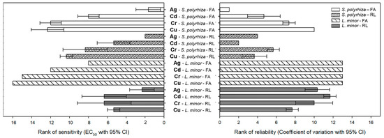 For S. polyrhiza, the most sensitive assays (based on mean rank of the EC50 values) were measures of Ag toxicity using either RL or FA as endpoints. For L. minor, measuring Ag toxicity with RL was the most sensitive assay. The most reliable endpoint-metal combinations (based on the mean rank of the CV) were either FA-Ag or RL-Cd for S. polyrhiza. Other assays, including RL for Ag, Cd, Cr, and Cu, had intermediate levels of sensitivity for both species. Assays based on RL and FA (except FA-Ag) had moderate levels of reliability for S. polyrhiza.