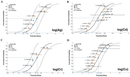 Species sensitivity distribution (SSD) curves for two duckweeds displaying (A) Log(HC05_Ag), (B) Log(HC05_Cd), (C) Log(HC05_Cr) and (D) Log(HC05_Cu). CAR, carotenoid content; CHL, chlorophyll content; DW, dry weight; FA, frond area; FAB, frond abscission; FN, frond number; FW, fresh weight; GR, growth rate; RL, root length. References [13,19,30,31,32,33,34,35,36,37,38].