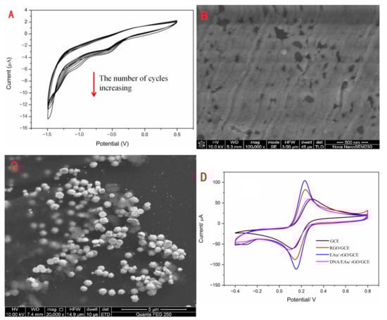 Electrochemical measurements were operated with the CHI760B electrochemistry system produced by Chenhua Instrument (Shanghai, China). The three-electrode system consisted of a GCE as the working electrode (WE), a saturated calomel electrode (SCE) as the reference electrode and a Pt foil counter electrode. A JSM-6360LV scanning electron microscope (JEOL Ltd., Tokyo, Japan) was utilized for Scanning Electron Microscopy (SEM). Transmission electron microscopy (TEM) images were created with a JEOL-1230 electron microscope (JEOL, Japan) at 100 kV. The syntheses of rGO were carried using cyclic voltammetry (CV), and the potential ranged from −1.5 to 0.5 V with a sweep speed of 0.01 V/s. Chronoamperometry was applied for EAu syntheses in the potential of 0.18 V. DPV was performed in the potential changing from −0.8 to 0 V under 25 mV amplitude, 4 mV pulse width and 0.2 s pulse period.