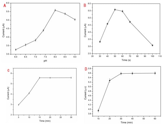 For achieving the optimum current signal response, a sequence of condition tests was carried out by DPV. The parameter analyses of S1/EAu/rGO/GCE were executed with three replicates. All the optimization experiment parameters and experiment steps were followed as shown in Section 2.2 via the controlling variable method. The experimental conditions effect of pH, electrodeposition time of EAu, treatment time of MB, and reaction time between S1 and Pb2+ ions were tested under the condition of 0.5 μM Pb2+.