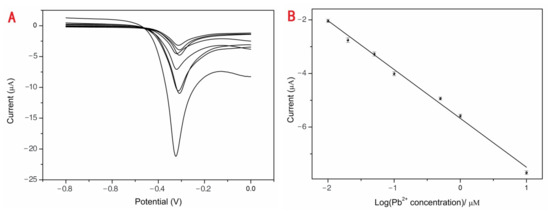 The DPV responses of Pb2+ sensor (A). The current responses increased with concentrations of Pb2+: 0.01, 0.02, 0.05, 0.10, 0.50, 1.00, 10.00 and 100.00 μM. The linear relationship between the DPV peak current changes and the logarithm of concentrations of Pb2+ (B).