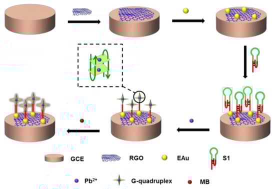 Lead, as one of the most widely utilized metal materials, is not biodegradable and can cause serious health and environmental issues [1,2]. Therefore, it makes a lot of sense to precisely and sensitively detect and analyze it in the fields of environment monitoring, agricultural industry, food tracking and clinical toxicology et al. [3,4]. Thus far, traditional detection methods, such as inductively coupled plasma mass spectrometry (ICP-MS) [5,6], high-performance liquid chromatography (DHPLC) [7,8] and cold vapor atomic fluorescence spectrometry (CVAFS) [9,10] have been utilized for lead detection. These detection technologies can accurately, stably and sensitively determine targets. However, the large equipment of these detection technologies is difficult and costly to maintain, and complex to operate. Also, with the increasingly complex pollutant compositions and the smaller order of pollutant concentrations causing low damages, it is difficult to provide enough appropriate methods for the requirements of analyses and determinations now [11,12]. Nevertheless, the sensitive, rapid and low-cost sensors applied for target detections have gained more attention, and offer a potential method for online and in situ monitoring. So far, many researchers have employed diverse biosensing methods for Pb2+ detection and monitoring. Pb2+ biosensors could be constructed with a portable and paper distance device based on specific DNA capture with rapid detection performance in real water samples [13]. A biosensor based on a spherical nucleic acid fluorescence probe binding on Au nanoparticles was fabricated for the specifical detection of Pb2+ in complex samples due to its excellent nuclease resistance [14].