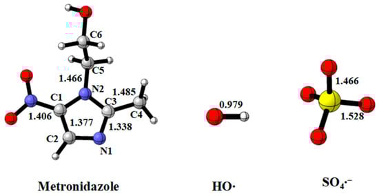 Optimized structures of MNZ, HO•, and SO4•− at the M06-2X/6-31+G(d, p) level. Bond lengths are given in angstroms