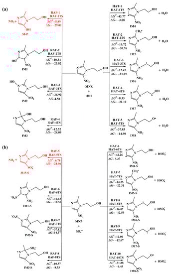The detailed initial reaction pathways of MNZ with HO• and SO4•− including Gibbs free energy of activation (ΔG≠) and Gibbs free energy of reaction (ΔG). All values are in kcal mol−1. (a) MNZ with HO•; (b) MNZ with SO4•−. The lowest energy barriers pathways are marked in red.