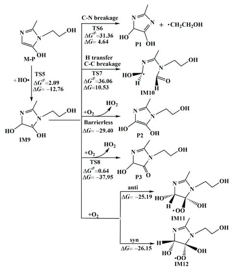 In order to investigate the products of MNZ degradation in wastewater in detail, the secondary reaction pathways of M-P obtained from reacting MNZ with HO• were investigated at the double level of M06-2X/6-31+G(3df, 2p)//M06-2X/6-31+G(d, p).