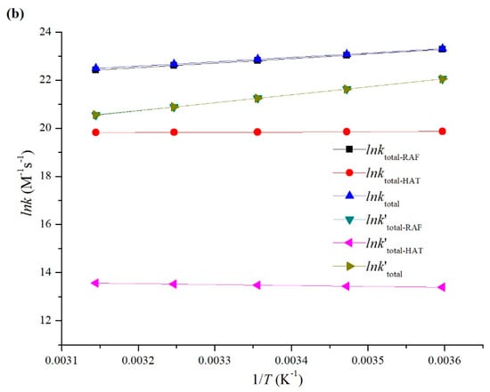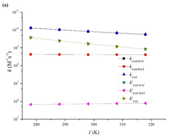 The calculated total rate constants (ktotal and k′total), the total addition rate constants (ktotal−RAF and k′total−RAF), and the total hydrogen abstraction rate constants (ktotal−HAT and k′total−HAT) for the corresponding reactions of MNZ with HO• and SO4•− in the temperature range of 278–318 K. (a) k vs. T; (b) lnk vs. 1/T.