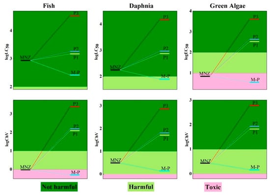 As shown in Table S7, the acute toxicity values of the initial degradation product of M-P were 260.97, 79.78, and 3.56 mg L−1 for fish, daphnia, and green algae, respectively. And the chronic toxicity values of M-P were 0.50, 1.37, and 1.45 mg L−1 for fish, daphnia, and green algae, respectively. The toxicity evolution of MNZ and its major degradation products is shown in Figure 6. The toxicity level of the initial degradation product of M-P was increased for fish, daphnia, and green algae. The toxic predication for DMZ and ONZ degradation also showed that the initial degradation products of D-P and O-P enhanced aquatic toxicity. The toxicity levels of P1, P2, and P3 were decreased and found not to be harmful to three aquatic organisms. Similarly, in the study of DMZ and ONZ with HO•, it was indicated that most of the secondary degradation products were not harmful to aquatic organisms. Thus, the risk of degradation of MNZ should be a concern in the formation process of M-P.