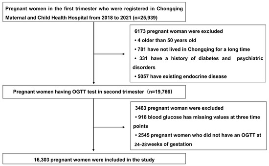 A total of 25,939 volunteers were recruited and screened for participation in the study. Of these, 9636 pregnant women were ineligible or excluded from the final analysis, and the reasons included: being aged over 50 years (n = 4); not being a long-term resident of Chongqing (n = 781); having a history of diabetes, mental illness, and a family history of diabetes (n = 331); having an existing endocrine disease (excluding diabetes and other endocrine diseases, including thyroid, adrenal, and hypothalamic diseases; n = 5057); missing values for blood glucose at three time points (n = 918); and OGTT not performed at 24–28 weeks of gestation (n = 2545). Finally, 16,303 volunteers were included in the analysis. The flowchart of the recruitment of the volunteers included in this study is shown in Figure 1.