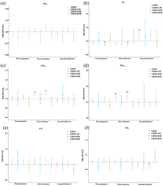 Adjusted odds ratios (ORs) and 95% confidence intervals (CIs) for air pollution exposure (per IQR) and risk of GDM, GDM-IFH, GDM-IPH, and GDM-CH in single-pollutant models, 2018–2021. (a) Effect of NO2 exposure during different trimesters on the risk of GDM and various subgroups. (b) Effect of O3 exposure during different trimesters on the risk of GDM and various subgroups. (c) Effect of PM10 exposure during different trimesters on the risk of GDM and various subgroups. (d) Effect ofPM2.5 exposure during different trimesters on the risk of GDM and various subgroups. (e) Effect of CO exposure during different trimesters on the risk of GDM and various subgroups. (f) Effect of SO2 exposure during different trimesters on the risk of GDM and various subgroups. Bonferroni corrections with significance (p < 0.006), ** p < 0.006, and *** p < 0.001. Abbreviations: GDM, gestational diabetes mellitus; GDM-IFH, GDM with isolated fasting hyperglycemia; GDM-IPH, GDM with isolated post-load hyperglycemia; GDM-CH, GDM with combined hyperglycemia; NO2, nitrogen dioxide; O3, ozone; PM10, inhalable particulate matter; PM2.5, fine particulate matter; CO, carbon monoxide; SO2, sulfur dioxide. Model adjusted for maternal age, first-trimester BMI, gravidity, parity, tobacco, alcohol, folic acid, assisted reproduction, macrosomia, multiple pregnancies, season of OGTT, temperature, and relative humidity.