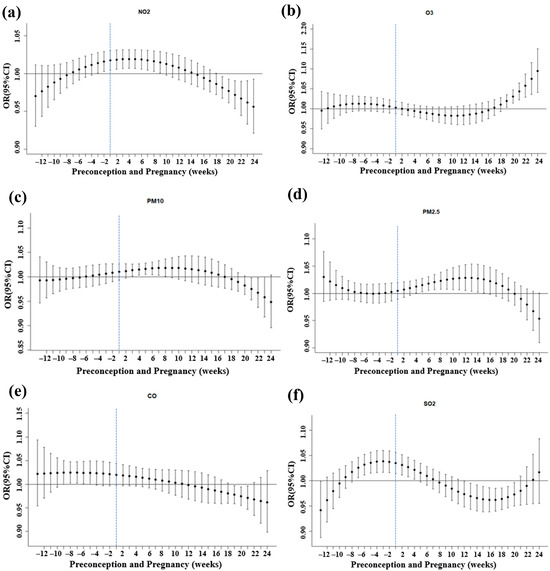 Adjusted odds ratios (ORs) and 95% confidence intervals (CIs) for the association of week-specific air pollution exposure (per IQR) with GDM risk in pregnant women, 2018–2021. (a) Effect of NO2 exposure at different gestational weeks on GDM. (b) Effect of O3 exposure at different gestational weeks on GDM. (c) Effect of PM10 exposure at different gestational weeks on GDM. (d) Effect of PM2.5 exposure at different gestational weeks on GDM. (e) Effect of CO exposure at different gestational weeks on GDM. (f) Effect of SO2 exposure at different gestational weeks on GDM. Preconception: weeks −12 to −1; first trimester: weeks 1 to 12; and second trimester: weeks 13 to 24. Abbreviations: GDM, gestational diabetes mellitus; NO2, nitrogen dioxide; O3, ozone; PM10, inhalable particulate matter; PM2.5, fine particulate matter; CO, carbon monoxide; SO2, sulfur dioxide. Model adjusted for maternal age, first-trimester BMI, gravidity, parity, tobacco, alcohol, folic acid, assisted reproduction, macrosomia, multiple pregnancies, season of OGTT, temperature, and relative humidity.