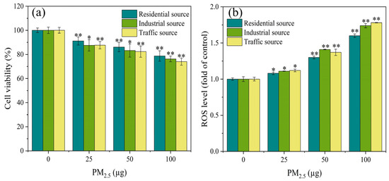 As demonstrated in Figure 2a, the cell viability of the A549 cells exhibited significant differences (p < 0.05) from the control group at PM2.5 exposure levels of 25, 50, and 100 μg. Additionally, the exposure dose of PM2.5 was in a dose–response relationship with the cell viability, and the higher the exposure dose, the lower the cell viability. The A549 cells were exposed to PM2.5’s organic components in Nanjing’s industrial and urban districts, and the results showed that the inhibitory effect on the cell viability in the industrial area samples was greater than that in the urban area samples during winter and spring [31]. The results in this study were similar, with differences in the toxicity of particles from different sources on the A549 cells. The toxicity of PM2.5 from the traffic source was the strongest, followed by the industrial source, and the residential source had the lowest toxicity. This might be related to differences in the chemical composition of PM2.5 from different sources. The results of the component analysis indicated that water–soluble ions, PAHs, and heavy metals components had the highest content in the traffic–source samples, followed by the industrial areas, and the lowest content in the residential sources. This might be the reason for the differences in cytotoxicity of PM2.5 from the different sources.