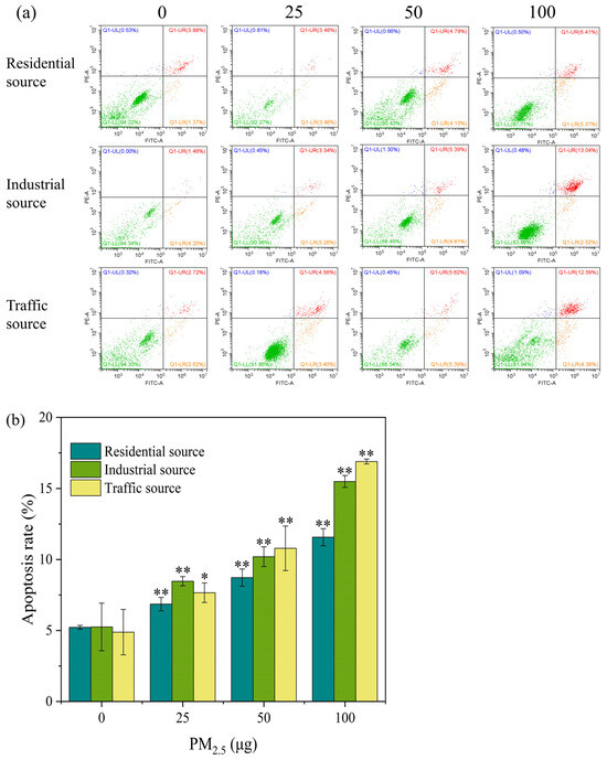 (a) Apoptosis flow cytometry of A549 cells exposed to PM2.5 at the ALI for 4 h. The exposure concentrations from left to right are 0, 25, 50, and 100 μg, respectively. Compared with the control group, the apoptosis rate of each exposure group increased in a dose–dependent manner. Green, orange, red, and blue within the quadrant represent the proportion of live cells, early apoptotic cells, late apoptotic cells, and dead/necrotic cells, respectively. (b) The apoptosis rate of A549 cells after 4 h of exposure. “*” means p < 0.05, “**” means p < 0.01.