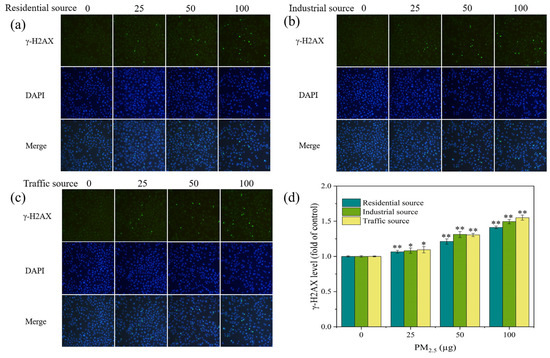 (a–c) Fluorescence images of γ–H2AX in A549 cells exposed to PM2.5 at the ALI for 4 h. The exposure concentrations from left to right are 0, 25, 50, and 100 μg, respectively. Compared with the control group (0 μg), the fluorescence intensity of each exposure group increased. (d) Level of γ–H2AX in A549 cells after 4 h of exposure. Compared with the control group, “*” means p < 0.05, and “**” means p < 0.01.