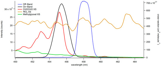 Absorbing species’ absorption cross-sections indicate the absorption on-band and off-band. This is used for the on-band (in black) and off-band (in blue) detection of CHOCHO (absorption cross-section shown in red) and methylglyoxal (absorption cross-section shown in green). NO2’s absorption cross-section is shown in brown.