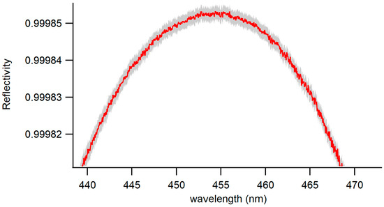 Reflectivity curve of the BBCEAS cavity as a function of wavelength (red). Uncertainty associated with the measured values is shown in gray.