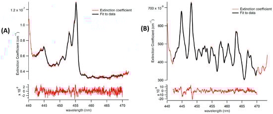 Fit (in black) to measured extinction (in red) and fit residuals using the spectrometer. (A) A representative fit of CHOCHO and methylglyoxal is being detected. (B) A representative fit of co-detection of CHOCHO and methylglyoxal in the presence of NO2.