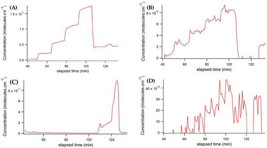 Additionally, water vapor was measured and is shown in Figure 6D. Its temporal variation followed a pattern like glyoxal, depending on the volume of air passed through the bubbler.