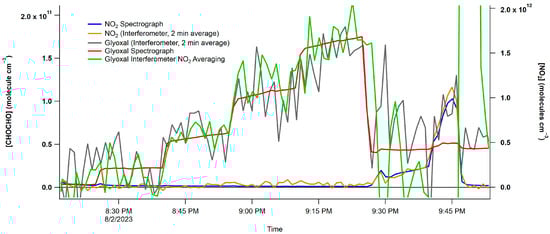 The plot showcases the five CHOCHO concentrations and highlights the interference from NO2 in the final section. The CHOCHO concentration was determined using two methods: first, a rolling boxcar method, displayed in black, was employed to smooth the raw data. Second, the data were averaged over two minutes and then plotted. These two smoothing techniques were subsequently compared to the spectrograph concentrations, as shown in Figure 8. The NO2 trace of two-minute averaged data closely follows the trends in the spectrograph’s data. It is worth noting that the CHOCHO data exhibits more noise compared to the spectrograph data; however, both the two-minute averaged data and the NO2 averaged data effectively capture the trends seen in the spectrograph data.
