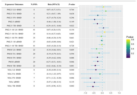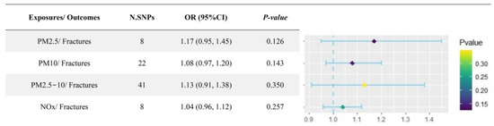 3.2. Stage 1 Causal Associations between Air Pollutants and BMD and Bone Fracture Risk