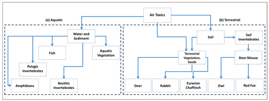 Example of transport pathways and fate of air toxics into example (a) aquatic and (b) terrestrial ecosystems.