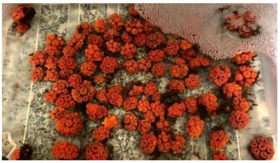 Approximately 250 colonies of T. coccinea were collected by scuba diving in the Alcatrazes Archipelago Wildlife Refuge in Southwestern Brazil (see Figure S1 in the Supplementary Materials), a federal marine protected area (MPA). Colonies were manually removed from the rocky reefs during removal operations organized by the authorities responsible for the MPA (ICMBio). The collections were authorized according to License SISBIO #79823-1.