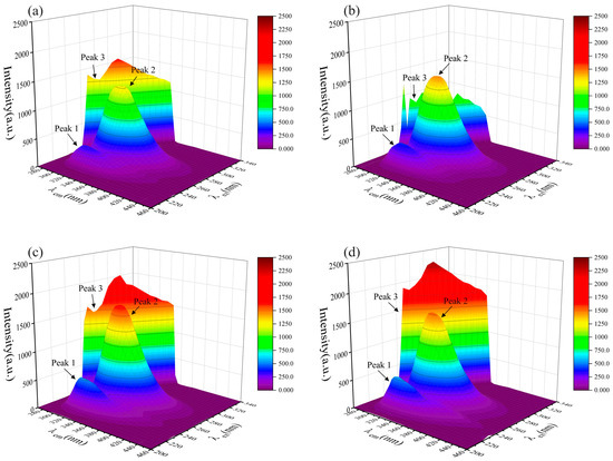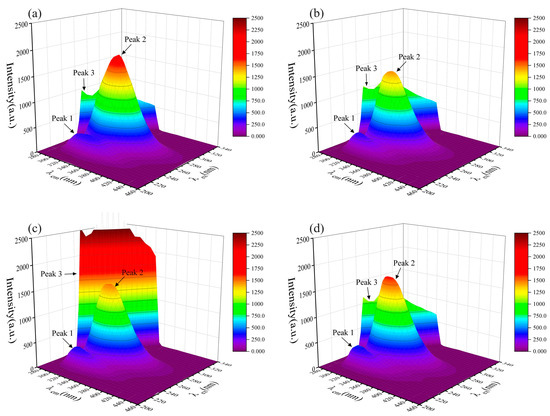 Three–dimensional fluorescence spectrogram for the bindings between HSA and novel PFASs alternatives: (a) HSA–9Cl–PF3ONS, (b) HSA–11Cl–PF3OUdS, (c) HSA–HFPO–DA, (d) HSA–NaDONA.