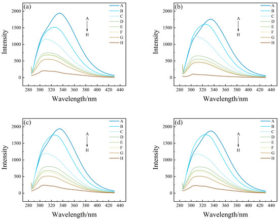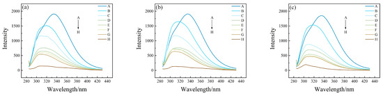 In order to clarify the mechanism of endogenous fluorescence quenching of HSA by PFASs, the effects of different concentrations of PFASs on the fluorescence spectrum of HSA were investigated. From A to H, the concentration ratios of HSA to PFASs were 5:0, 5:1, 5:5, 5:10, 5:15, 5:20, 5:30, and 0:5, respectively. Under 275 nm light excitation, the intensity of HSA endogenous fluorescence gradually decreased with the increasing concentration of PFASs. Although there was no obvious change in the peak shape, the fluorescence emission peak was blue-shifted from 335 nm to 310 nm. This indicated that the target PFASs interacted with HSA.