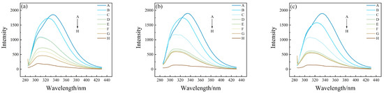Two-dimensional fluorescence spectrogram for the bindings between HSA and long-chain PFASs: (a) HSA–PFOA, (b) HSA–PFHxS, (c) HSA–PFOS.